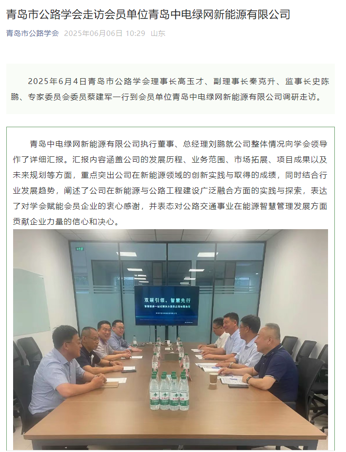 2025 年 6 月 4 日,青島市公路學會理事長高玉才、副理事長秦可升、監事長史陳鵬、專家委員會委員蔡建軍一行調研走訪會員單位 —— 青島中電綠網新能源有限公司。 本次調研活動安排豐富且充實,學會領導們首先參觀了青島中電綠網新能源有限公司的工廠與展廳。在參觀過程中,公司負責人詳細介紹了工廠的生產流程、技術工藝以及產品應用等,并展示了展廳內各類具有代表性的新能源產品,讓學會領導們對公司有了直觀且深入的了解。