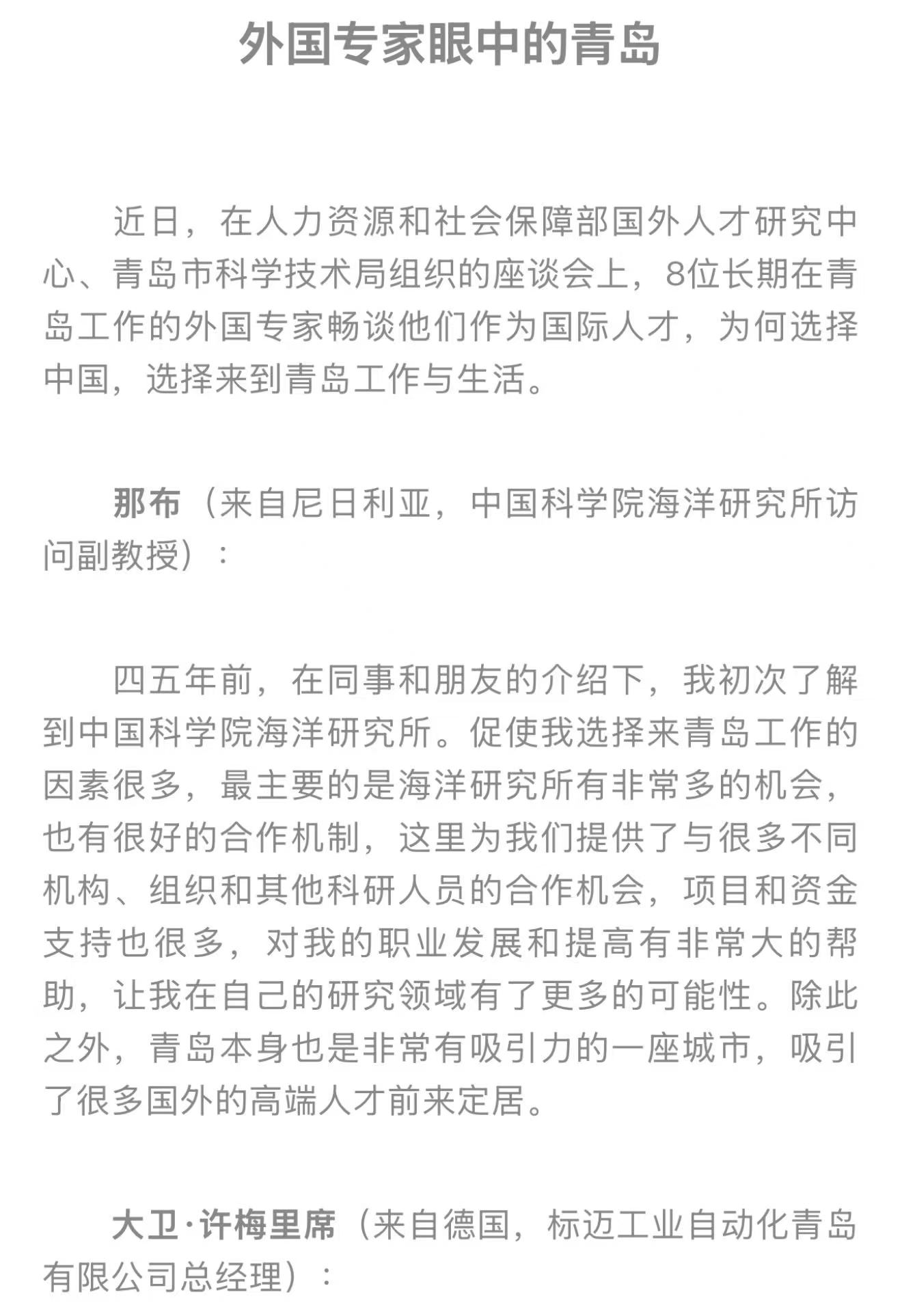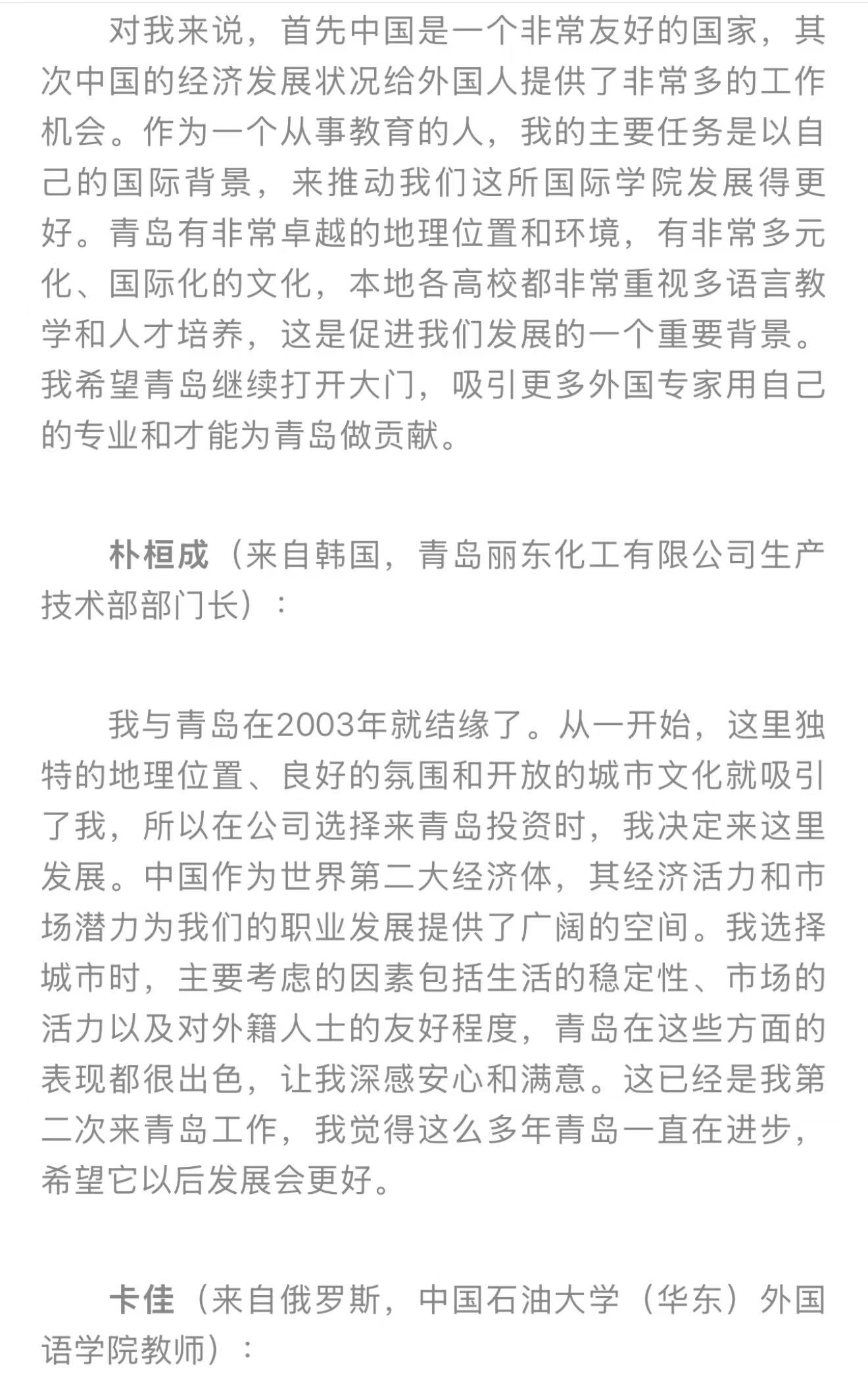 紅瓦綠樹,碧海藍天。山東青島已累計13次入選“魅力中國——外籍人才眼中最具吸引力的中國城市”前十榜單。作為一座沿海開放城市,青島始終處在中國對外開放的前沿,大量外國專家被這座城市吸引,定居、工作于此,為這座城市的建設與發展作出貢獻。